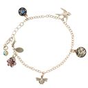 Assorted* bee, bird, flower ,dragonfly, and tree of life charms on an adjustable linked bracelet chain. Plated in sterling silver with Austrian crystals and enamel and assembled in Vermont.