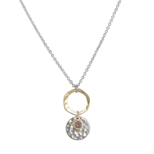 Mixed metal components as well as a crystal dangle provide a complementary touch of modernism to this hammered metal pendant. The pendant is made in America and hangs from an adjustable 16"-19" chain.
