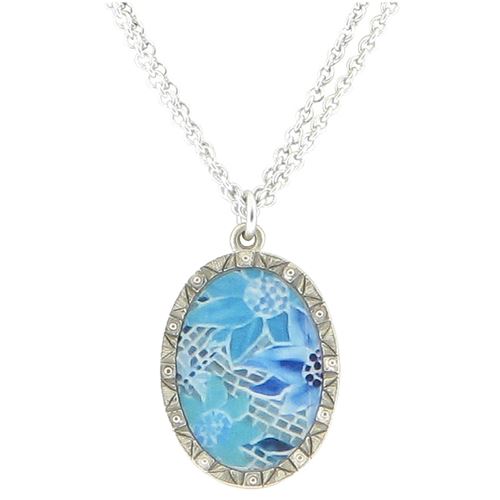 16"-19" adjustable necklace with vintage paper in a sterling silver plated oval settting. Made in America; pendant height 1".