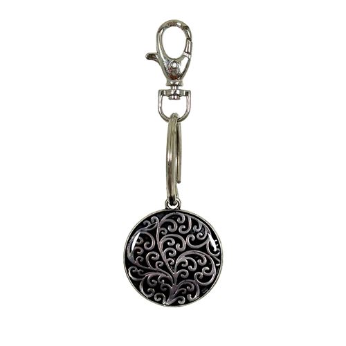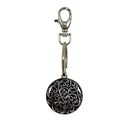Scroll pattern keychain/bag charm with an enamel overlay and textured back. Available in two colors.