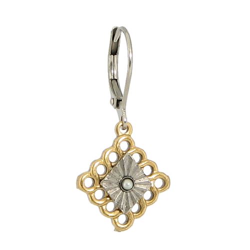 A unique mixed metal combination of textures with a hint of sparkle, these diamond shaped earrings are as stylish as they are wearable. Dangling from hinged ear wires, they are plated in both sterling silver and 14 karat gold. Made in America. Coordinating necklaces are available.