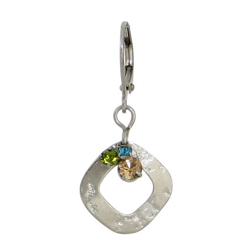 A delicately textured diamond shaped hoop is a flattering backdrop to a cluster of multi-colored and sized Austrian crystals. Made in America.