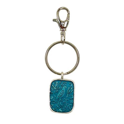 Vintage bird motif keychain/bag charm with an enamel overlay and engraved bird motif on the back. Available in three colors.